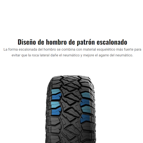 La forma escalonada se combina con material esquelético más fuerte para evitar que la roca lateral dañe el neumático y mejore el agarre del neumático.